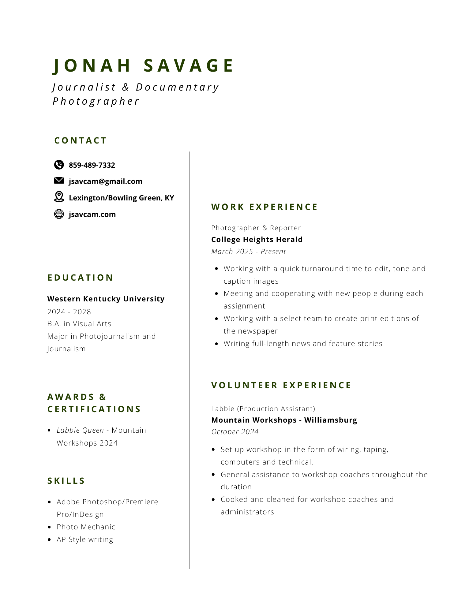 Jonah Savage is a photographer and multimedia content creator from Woodford County, Kentucky. He is studying Journalism and Visual Journalism & Photography at the acclaimed Western Kentucky University's VJP program.