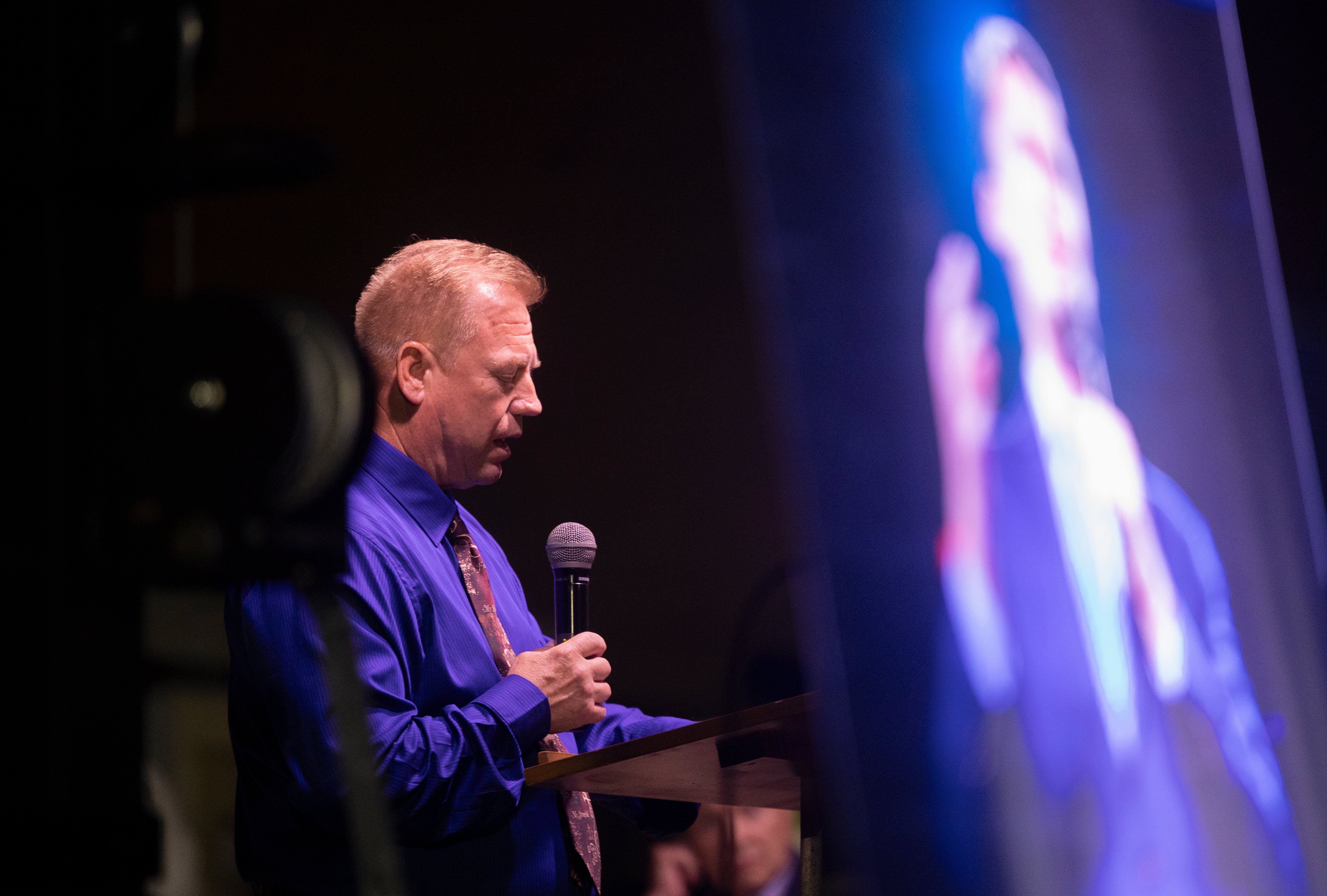 Pastor Roger Ryan of Fountain Ministries delivers a sermon and leads the crowd in prayers at the Charlie Kirk Candlelight Vigil on Thursday, Sept. 25, 2025 on South lawn.