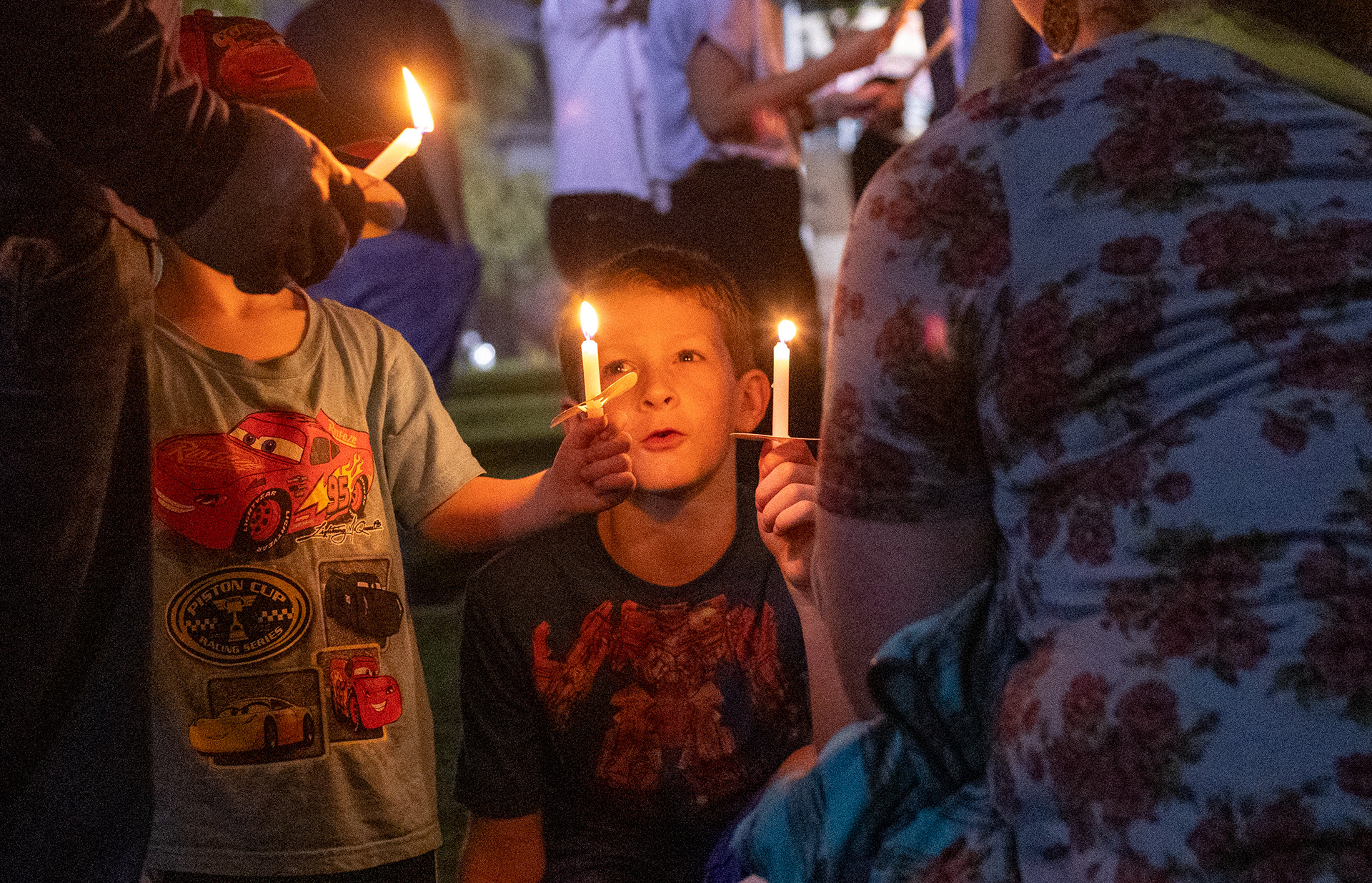 Bear Sweets, a child attending the Charlie Kirk Candlelight Vigil, smiles with his family while holding his candle on Thursday, Sept. 25, 2025 on South Lawn.